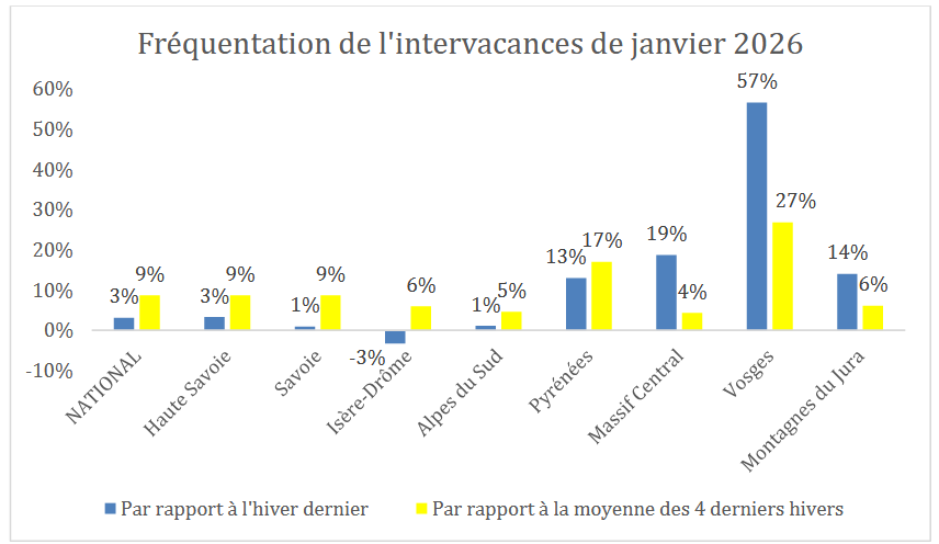 Dans sa dernière note de conjoncture, Domaine Skiables de France se félicite de la très bonne fréquentation de mois de janvier. « L’intervacances a tenu ses promesses dans tous les massifs, grâce à une bonne météo. La fréquentation de ce mois de janvier s’établit 3% au-dessus de la saison dernière et 9% au-dessus de la moyenne des 4 précédents hivers », précise DSF. Les Alpes et les Pyrénées poursuivent une saison qui avait déjà bien commencé. La période permet en outre au Massif Central (+19% sur la période par rapport à janvier 2025), aux Montagnes du Jura (+14%) et au Massif Vosgien (+57%) de réduire en partie le retard pris en début de saison. « Les Alpes consolident leur avance, entre 7 et 11% au-dessus de la moyenne des 4 précédents hivers. Les Pyrénées enchaînent deux très belles périodes et affichent une avance deux fois plus importante que celle des Alpes. Enfin, malgré un bon mois de janvier, le Massif Central, les Montagnes du Jura et le Massif Vosgien gardent les stigmates de vacances de Noël-Nouvel An très difficiles. Le Massif Vosgien est celui qui réduit le plus son retard, en parvenant à une fréquentation cumulée proche de la moyenne des 4 dernières saisons, avec des situations contrastées au sein du massif », précise DSF. Au niveau national, la fréquentation des pistes depuis le début de la saison est similaire à celle de l’an dernier.